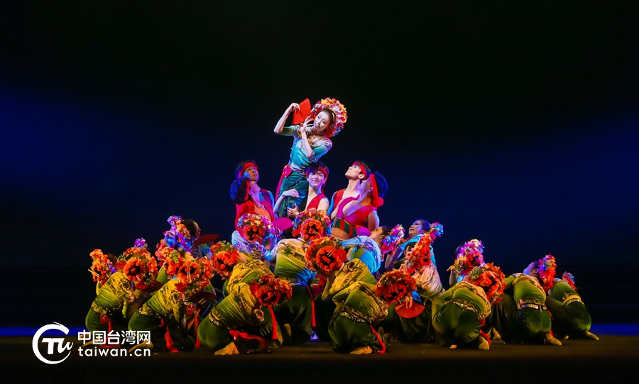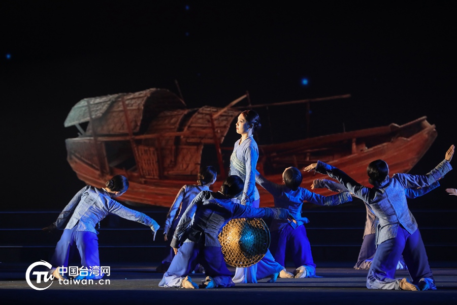 緊接著,洋溢著閩南風情的舞蹈《一圍簪花一灣峽》上演,借助“簪花圍”這個承載漁家人情感和記憶的文化符號,述說蟳埔漁家女子與臺灣高山族男子相遇、相知、相許的海峽情緣,傳遞出海峽兩岸各族同胞血脈相連的深情厚誼與盼望團圓的美好願景。