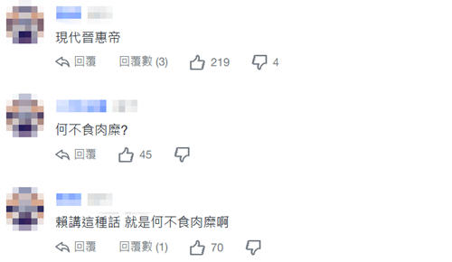 還有臺灣網友在相關新聞下跟帖表示,“古書中晉惠帝,原以為是後人誣蔑,現在終于知道其可能了!”“民進黨官員有錢有閒啊!”“合法要飯的青鳥:我們就是有錢又有閒的代表作,一整年無所事事搞大罷免還有錢可拿!”“活在平行時空,呵呵”“古有晉惠帝:何不食肉糜?今有清德宗:有錢有閒看演唱會”。有人結合自身經歷質疑,“就是一直得不到工作啊!請問一下,失業一年的臺灣人真的有錢有閒去看這些明星的表演嗎?銀行賬戶只剩一千多新臺幣的人,是要怎麼追星看表演?”