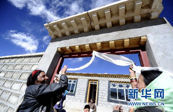 拉薩市當雄縣納木湖鄉恰嘎村2組牧民達瓦次仁(左)和妻子給新房門上獻上哈達(1月25日攝)。藏歷新年前夕,記者走進了海拔4718米的拉薩市當雄縣納木湖鄉恰嘎村2組牧民達瓦次仁的家里。屋外天寒地凍,屋內暖意融融。“我家是去年10月搬進新房的,我們馬上要在新房里過藏歷新年。這會是一個舒服的新年。”達瓦次仁說。他家去年被納入西藏正在實施的農牧民安居工程中。當雄縣政府請來了施工隊為整個小組的牧民修新房。按照安居工程政策,政府承擔了5萬多元修房款中的絕大部分。納木湖鄉的新房是西藏正在大力實施的農牧民安居工程的一個縮影。2006年起,西藏實施了以農房改造、遊牧民定居和扶貧搬遷為重點的農牧民安居工程,對改善住房條件的農牧民予以補助。截至目前安居工程累計投入資金170億元,使全區住房條件比較差的27.5萬戶、143萬農牧民住上了安全舒適的房屋。新華社記者 格桑達瓦 攝