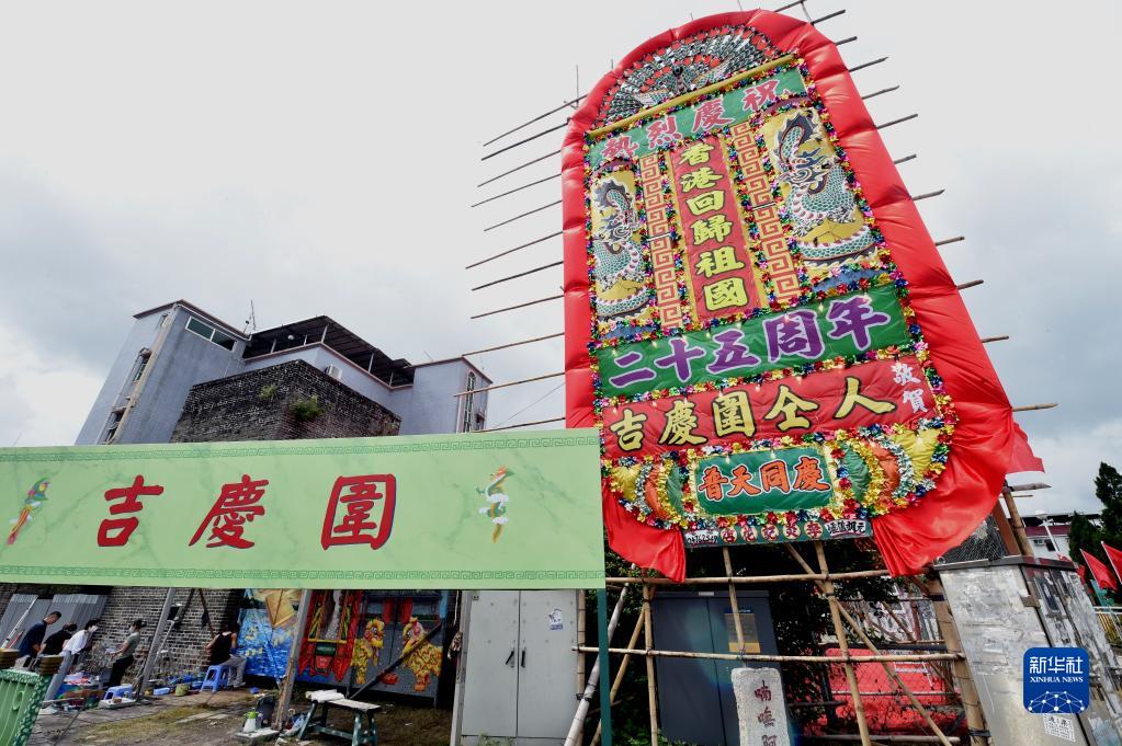 6月20日,香港吉慶圍挂上慶祝香港回歸祖國25周年花牌。