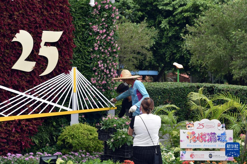 6月20日,工作人員在香港荃灣公園布置慶祝香港回歸祖國25周年花圃。