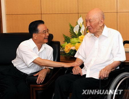 中國新聞網8月7日報道 今年是新中國成立60周年,中共中央政治局常委、國務院總理溫家寶6日上午冒著細雨,登門先後看望了60年來為我國科技、衛生事業做出突出貢獻的朱光亞、何澤慧、錢學森、王大珩和胡亞美,向他們致以親切的問候和良好的祝願。