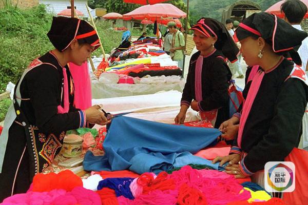 2002年2月9日,在雲南省金平縣金水河鄉,瑤族婦女李春蘭(左)在中越邊境的金水河口岸向越南少數民族婦女出售布料。