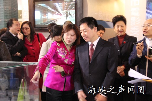 臺北市副市長李永萍(前左)在臺灣館向國臺辦葉克冬副主任(前右)介紹參展作品。