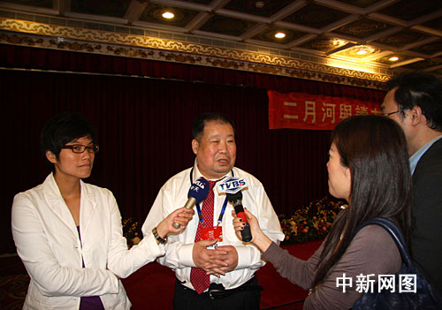 由中共中央委員、原河南省委書記徐光春率領的河南省大型參訪團正在臺灣訪問。圖為隨團首次赴臺的大陸著名作家二月河15日在臺北圓山大飯店接受臺灣媒體記者訪問。中新網發 陳立宇 攝