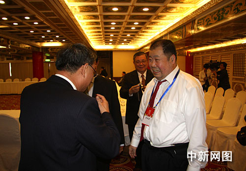 圖為隨團首次赴臺的大陸著名作家二月河15日在臺北圓山大飯店與臺灣二月(右一)河讀友會會員相見歡。中新網發 陳立宇 攝