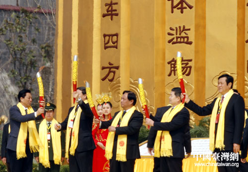 梁國揚等人引燃聖火火炬,向臺港澳及海外華人代表分贈聖火。