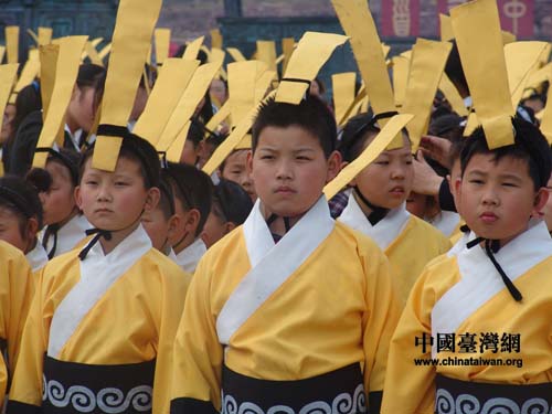開幕式上身著黃色漢服的小學生(李傑 攝)