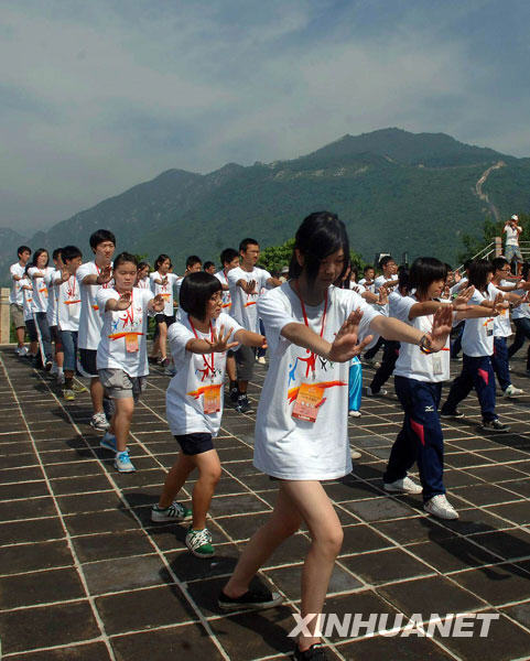 7月15日,參加“兩岸青年舞太極聚長城”活動的學生在長城上學練太極。新華社發(卜向東 攝)