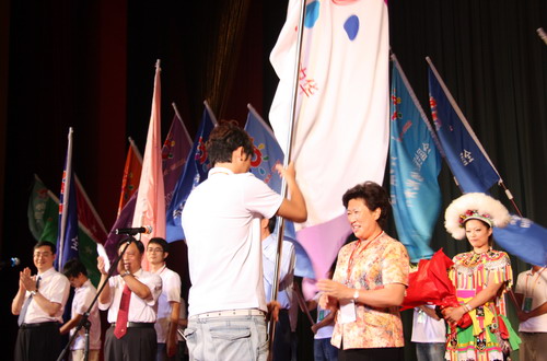 中央統戰部副部長尤蘭田授“龍脈相傳,青春中華”“全國臺聯2009年臺胞青年千人夏令營”總營旗。(中國臺灣網 芮文輝 攝)
