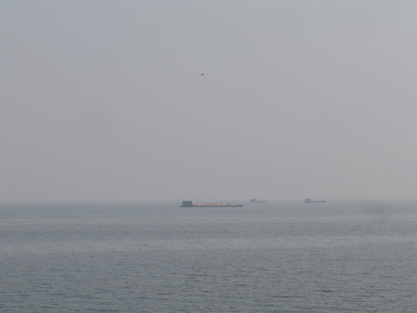 由于天氣濕熱,洞庭湖面上霧氣連連,另有一番景致;還有水鳥在湖面上飛翔。