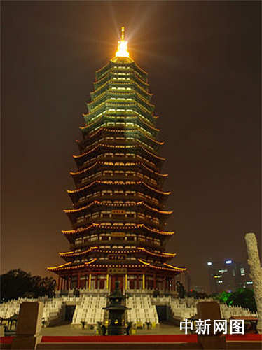 常州天寧寶塔通過燈光的變化,化身一支巨大的蠟燭,點亮星空。圖片來源:中國新聞網