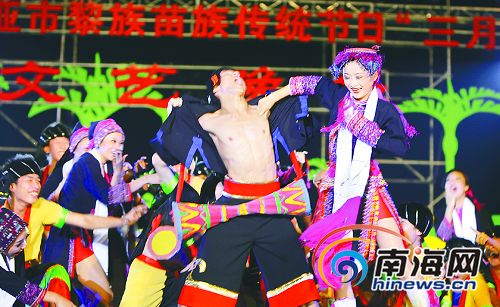 為慶祝黎族、苗族同胞的傳統節日“三月三”,三亞市27日在“夢里黎鄉”檳榔河旅遊區舉行了一場晚會以及一係列民族風俗競技活動,10萬市民和遊客涌進檳榔河,載歌載舞盡情聯歡。