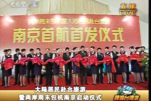 南京兩岸周末包機首航剪彩。(圖片來源:央視電視截圖)