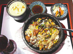 “苜宿芽、小黃瓜、紅蘿卜、玉米粒、豆芽、香菇、海苔,再加上獨家醬料腌漬後炸得香酥的雞肉,食材豐富營養。”王玉素說,她選用上等濁水米煮熟後,再放入高溫、涂有麻油的石頭鍋里,形成一層薄薄香脆的鍋粑,是她的招牌餐。