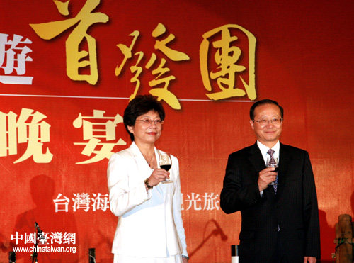 海旅會會長邵琪偉和臺旅會會長賴瑟珍邀請兩岸同胞舉杯同慶這一歷史時刻(李徽 攝)