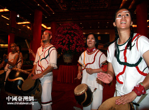 大陸遊客在饕餮美食之余,也在第一時間領略到了寶島多族群的奇異風情。來自臺灣東海岸花蓮的原住民音樂組合,獻上阿美人獨特的器樂表演。為歡迎大陸同胞,他們特別演繹《高山青》,此曲響起,容納800人的大宴會廳頓時化為歡騰的海洋,耳熟能詳的曲調大家分外開懷,臺上臺下的兩岸同胞舉杯同唱,酣暢淋漓,共慶這歷史性時刻。