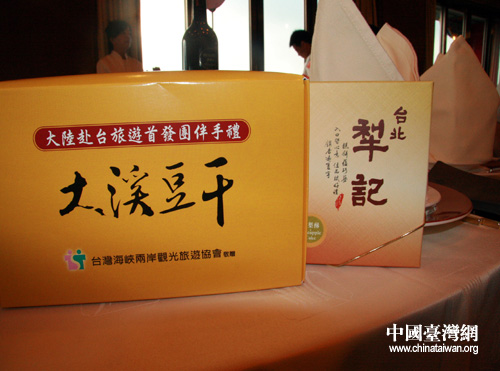 圓山飯店方面,為了當天接待備受矚目的首發旅遊團,亦做足準備。不僅大擺73桌宴席,更配備100多位訓練有素的服務人員。當晚奉送的10道菜肴,皆係臺灣各地著名的美食精饌,包括寶島錦繡拼、嘉南蒜子瑤柱脯、南投翡翠綠竹筍、金門面線扣肉蹄、以及澎湖梅汁鮮魚片、岡山羊肉爐、新竹炒米粉、彰化肉圓、九份芋圓挫冰,更少不了臺灣的四季鮮果,可謂炊金饌玉、香傳天下。此外,當晚760余位首發團大陸遊客,每天都得到一份伴手禮——臺北鳳梨酥和大溪豆幹。