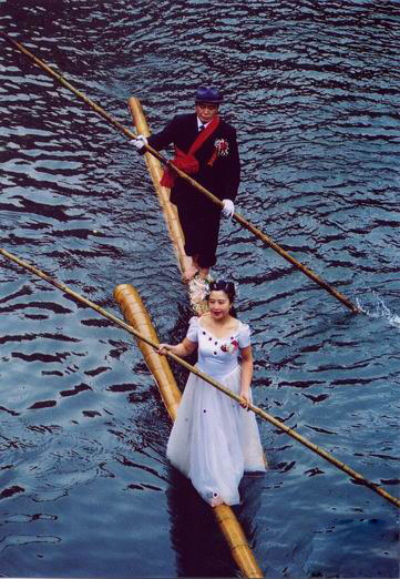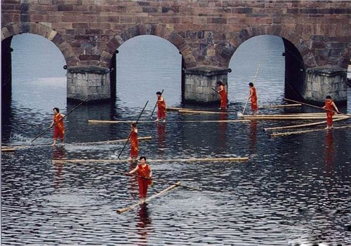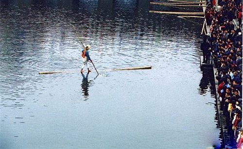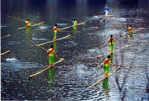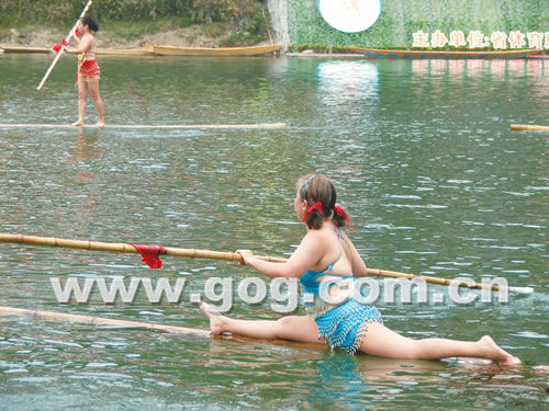 “獨竹漂”是指運動員腳踏漂流在水面上的單棵楠竹,依靠小竹竿劃動達到水上漂行的一項民族傳統體育項目。選手表演時赤著腳,手執一根細竹竿做“槳”,表演“乘風破浪”、倒退、轉身、繞彎、換竿等絕技,頗有“一葦渡江”之妙。