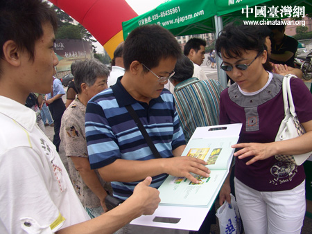 對臺灣農產品充滿好奇的南京市民正在翻看產品名錄。(魏萌)