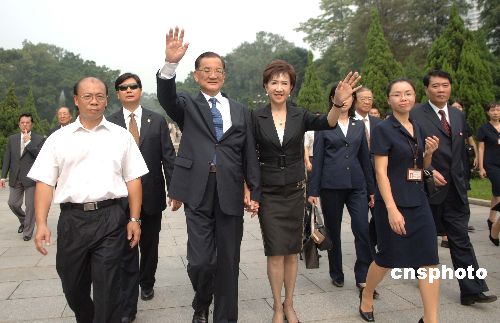 資料圖:2006年10月12日,中國國民黨榮譽主席連戰及夫人一行在黃花崗烈士陵園拜謁。一路上受到群眾熱烈的歡迎, 連戰及夫人一行向歡迎的群眾揮手致謝。 中新社發 何泉 攝