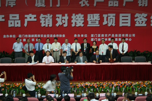 在簽約儀式之前,舉行了臺灣農產品介紹、廈門市招商項目推介以及產銷對接活動。據悉,為了辦好對接活動,廈門把大陸各省市有實力的農產品經銷商都邀請到場,他們都是從事水果、蔬菜、水產、糧油等農產品銷售的大批發市場、大經銷商,分別來自北京、上海、南京、合肥、福州等地。(徐麗麟)