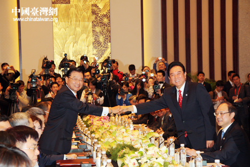 陳雲林與江丙坤握手。4月26日上午9時,海峽兩岸關係協會會長陳雲林與海峽交流基金會董事長江丙坤第三次會談在南京紫金山莊正式舉行。(中國臺灣網 鐘寶華 攝)