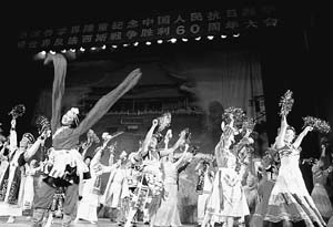 為紀念中國人民抗戰勝利60周年,法國華僑華人4日舉行文藝演出。圖為長江藝術團歌舞表演“愛我中華”。 本報記者 廖先旺攝 |