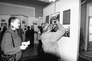 我駐俄使館5日舉行紀念中國人民抗戰勝利60周年圖片展。圖為俄羅斯觀眾在觀看圖片。 |