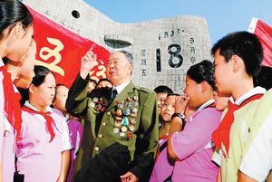 “九一八”紀念日臨近,前來沈陽市“九一八”歷史博物館參觀的群眾絡繹不絕。作為全國百家愛國主義教育基地之一,該館自開館以來已接待觀眾六百余萬人次。圖為九月七日,義務講解員、八十一歲抗日老戰士晏世祿在為孩子們講抗戰歷史。