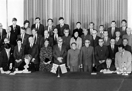 En la tarde del 19 de diciembre de 1984, Deng Xiaoping y la Primera Ministra inglaterra Sra. Margaret Thatcher asistieron a la ceremonia de firma del Comunicado Conjunto entre China y Gran Bretañ a.