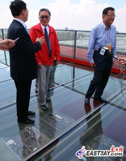 李敖和其家人在參觀中國館時還特地來到了60米觀景平臺,一覽世博園區的美景。剛走上觀景平臺,李敖就興衝衝地找起了東方明珠,在中國館館長徐滬濱的指引下,看到標志性三大高樓——東方明珠、金茂大廈、環球金融中心。在60米觀景平臺的透明走廊上,李敖一舉粉碎了“恐高”的傳言,站在透明走廊上俯瞰下方,還連連感嘆“美國大峽谷的透明長廊趕不上這里”。
