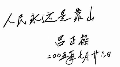 7月26日晚,北戴河休養地,大海的濤聲陣陣傳來,顯得更加靜謐。呂正操這位鶴壽101歲的老將軍,像每天一樣,看了新聞,寫好日記,但與往日不同的是,今天還實現了一個特殊的心願:面對我們帶去的冀中人民的問候,欣然提筆,一氣呵成這諍諍摯言,並深情地簽上自己的名字。之後,他鄭重托付本報捎給冀中的父老鄉親。