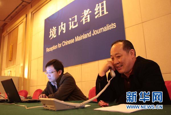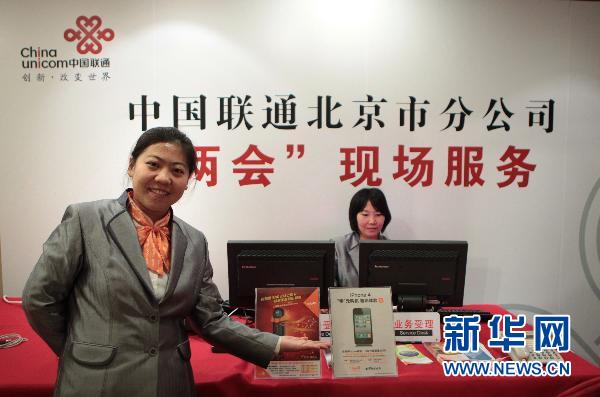 2月26日,中國聯通北京分公司的員工宋欣(左)在新聞中心值班。第十一屆全國人民代表大會第四次會議和中國人民政治協商會議第十一屆全國委員會第四次會議,將分別于2011年3月5日和3月3日在北京開幕。十一屆全國人大四次會議、全國政協十一屆四次會議在北京西長安街北側的梅地亞中心設立新聞中心,負責接待和安排中外記者對會議的採訪。新華社記者 邢廣利攝
