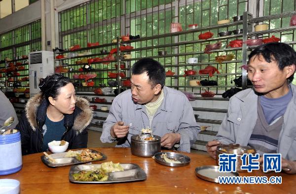 農民工全國人大代表胡小燕——為全國兩會做好準備胡小燕(中)在公司生產車間食堂和工友們交流(2月16日攝)。在廣東佛山打工十幾年,胡小燕獲得過公司所在地白坭鎮“十佳外來工”、三水區“十佳外來工”、佛山市“十佳外來工”稱號,2008年1月21日,經過廣東省十一屆人大一次會議第三次全體會議無記名投票,她成為中國第一位農民工全國人大代表。胡小燕現在在佛山市三水新明珠建陶工業有限公司工作。在完成日常工作的同時,她認真地履行職責。去年兩會,她提交了5項涉及農民工權益的建議,諸如醫保轉移、子女教育、技能培訓、工傷賠付等。一年來,她所關注的還是農民工子女入學、空巢老人等與農民工息息相關的議題。全國兩會在即,胡小燕也在積極為兩會做著最後的準備。新華社記者 陳曄華攝