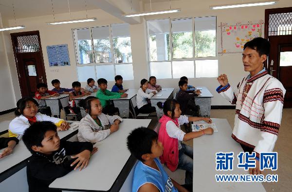 這是全國人大代表包布魯(右)在雲南省西雙版納傣族自治州景洪市基諾山基諾族鄉中心小學與一些學生做課後交談,了解他們對于學校教育方面的意見(2月25日攝)。新華社記者 藺以光 攝