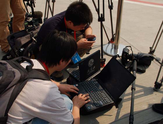 為及時發稿,記者幹脆席地而坐,手機電腦齊上陣。(張弛 攝)