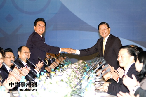 “陳江會談”,在致辭之後,陳雲林與江丙坤再次將手緊緊地握在了一起。(田雲鵬 攝)