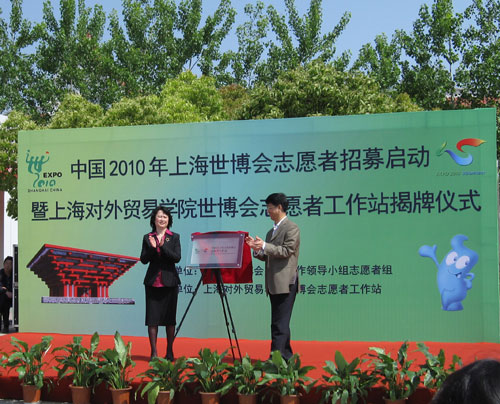 校黨委書記武克敏和黨委副書記、副校長陳潔共同為上海對外貿易學院世博會志願者工作站揭牌