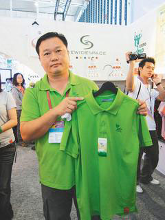世博志願者所穿的綠色POLO衫是正宗臺灣貨,穿在身上會越來越涼爽,符合節能減碳風潮。 圖片來源:臺灣《聯合報》