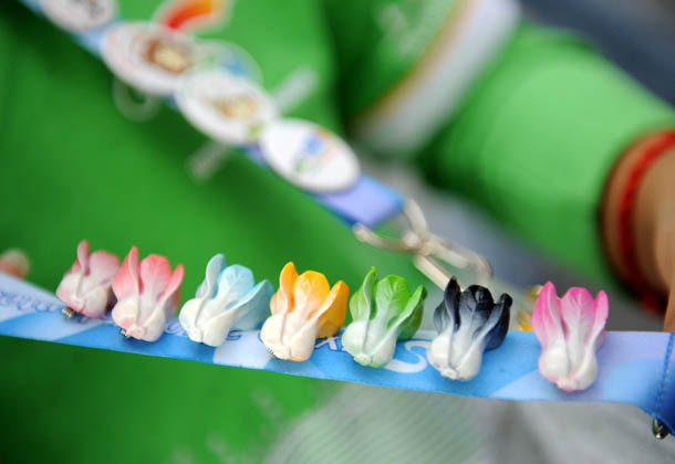 10月2日,一位世博志願者展示證件挂繩上不同顏色的小白菜裝飾。新華社記者 周科 攝