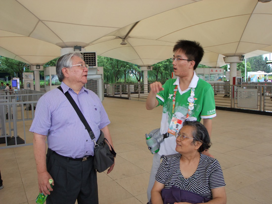 問清情況,熱情的“小白菜”們立即向帶隊老師做了匯報,老師趕到現場後,用自己的證件做抵押,租借了一輛急用時才允許借出的輪椅,並安排兩位剛從崗上輪換下來準備休息的“小白菜”王澤文、王灝等幾名同學,一路推送兩位老人遊覽世博園。