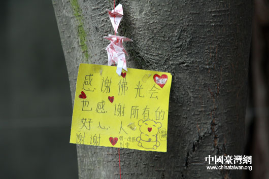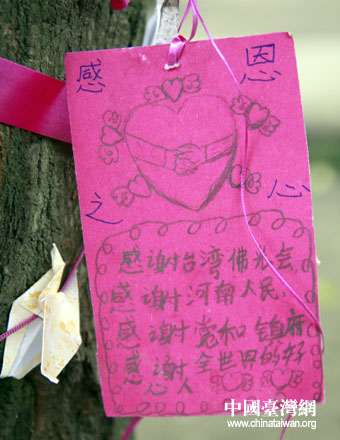 一走進彰明中學,兩岸記者就發現綠植上挂滿了各種卡片、千紙鶴等,仔細一看,發覺字里行間都是學生們親筆寫下的感謝與祝福。校長劉建雄告訴記者,這些都是學生們為表達對臺灣佛光會及對口援建省份河南等各地的愛心人士而精心制作,“5.12”地震1周年之際,學生們還將寫感謝信、感恩卡,在5月12日之前寄到臺灣國際佛光會總部,再表感謝。