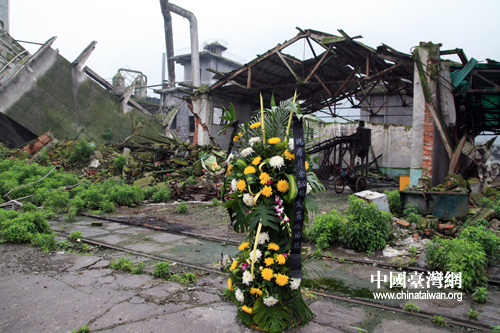 人們在廠區的入口擺上花籃憑吊地震中的罹難者。 (中國臺灣網 田雲鵬 攝)