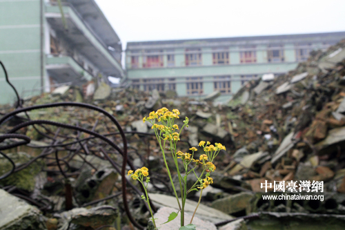 在地震遺址,處處都可見到這樣的黃色小花在廢墟上頑強地生長著。(中國臺灣網 田雲鵬 攝)