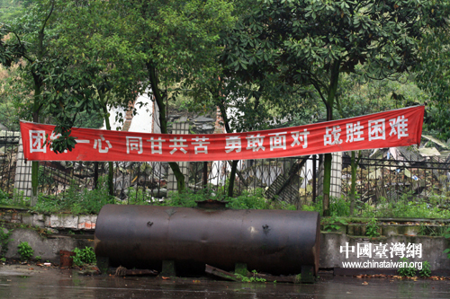 在廢墟中一片比較開闊的地帶,一條橫幅宣示著廠區職工和家屬抗震救災的決心和信心。(中國臺灣網 田雲鵬 攝)
