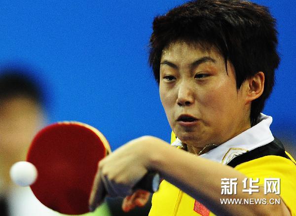 11月13日,中國選手郭躍在比賽中回球。當日,在第16屆亞運會女子團體小組賽A組第一輪比賽中,中國隊以3比1戰勝中華臺北隊。新華社記者徐家軍攝