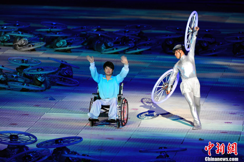 12月12日晚,2010亞洲殘疾人運動會在廣州奧體中心開幕,開幕式大型文藝表演《美麗的世界》由《心聲》、《追夢》和《飛翔》三個篇章構成,展示殘疾人自強不息、生命飛翔的動人樂章。中新社記者 陳文 攝