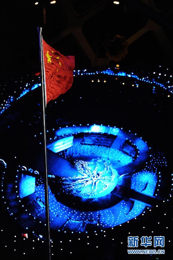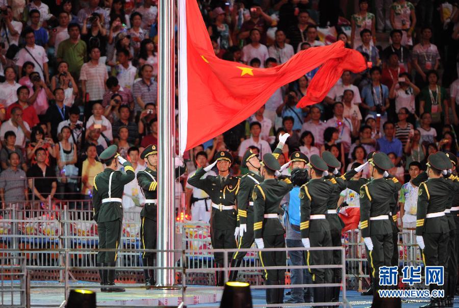 8月12日,第26屆世界大學生夏季運動會開幕式在深圳舉行。這是在開幕式上升起中華人民共和國國旗。 新華社記者郭勇攝