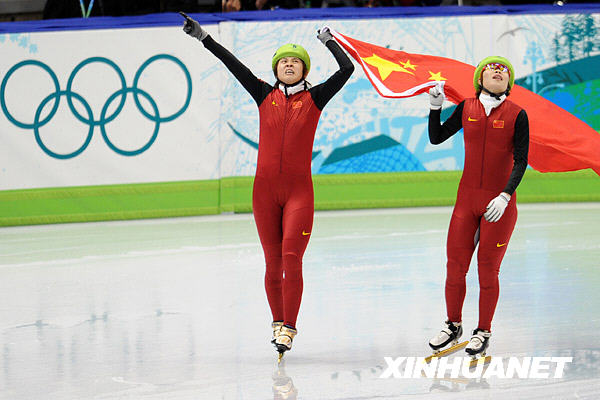 2月26日,在溫哥華冬奧會短道速滑女子1000米決賽中,中國選手王濛以1分29秒213的成績奪得冠軍。這是王濛(左)奪冠後與隊友周洋手持國旗慶祝。新華社記者楊磊攝